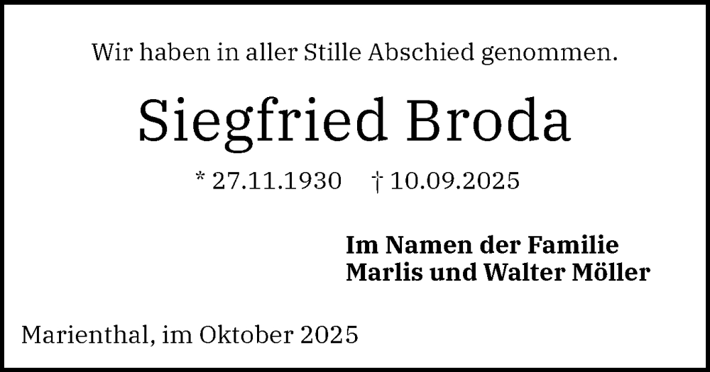 Hier finden Sie alle Traueranzeigen aus der Zeitung, die bisher für Siegfried Broda erschienen sind. Weitere Traueranzeigen, die in der Zeitung erscheinen, werden hier ebenfalls aufgelistet