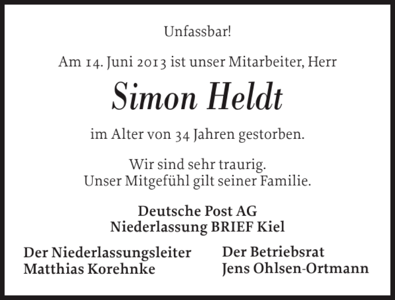 Hier finden Sie alle Traueranzeigen aus der Zeitung, die bisher für Simon Heldt erschienen sind. Weitere Traueranzeigen, die in der Zeitung erscheinen, werden hier ebenfalls aufgelistet
