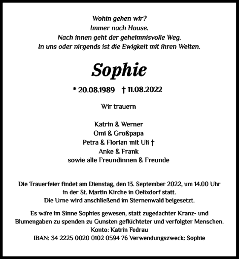 Hier finden Sie alle Traueranzeigen aus der Zeitung, die bisher für Sophie erschienen sind. Weitere Traueranzeigen, die in der Zeitung erscheinen, werden hier ebenfalls aufgelistet