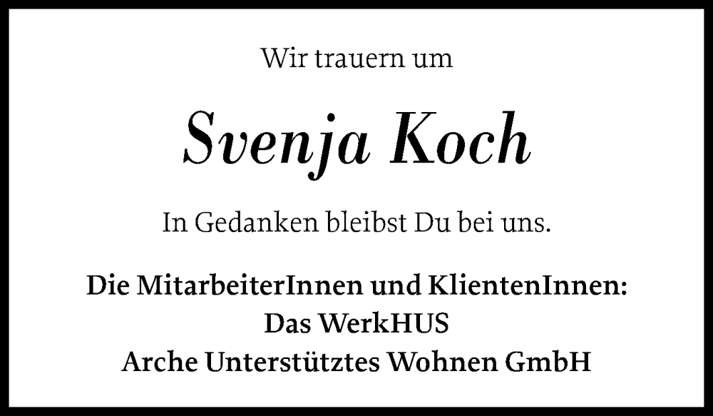 Hier finden Sie alle Traueranzeigen aus der Zeitung, die bisher für Svenja Koch erschienen sind. Weitere Traueranzeigen, die in der Zeitung erscheinen, werden hier ebenfalls aufgelistet