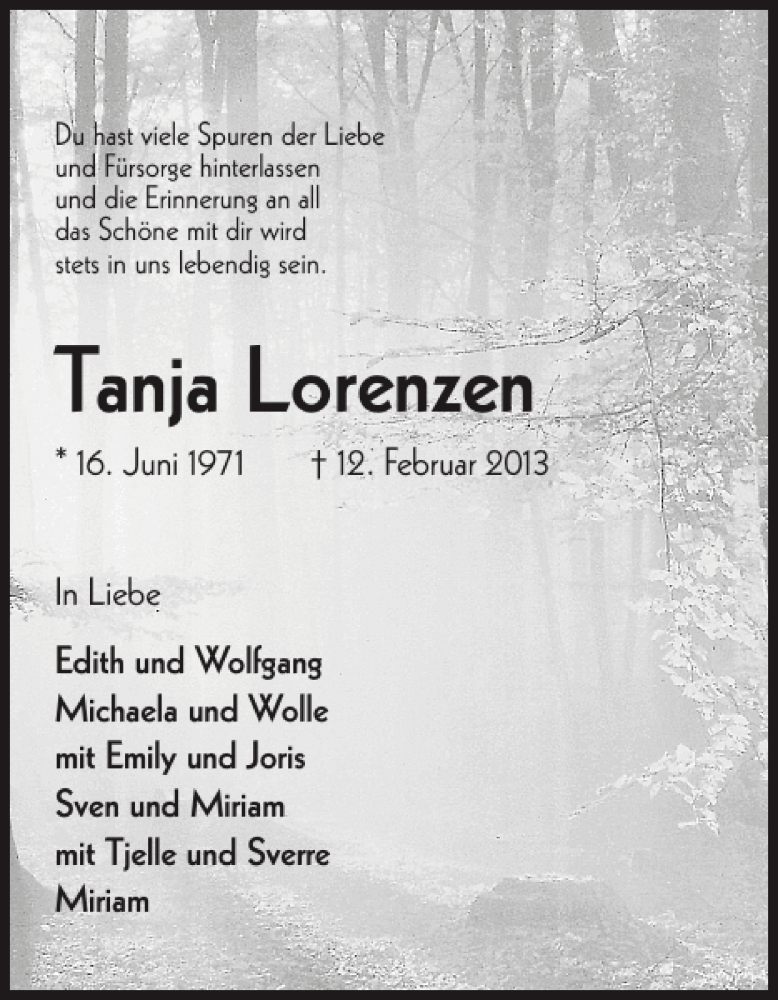 Hier finden Sie alle Traueranzeigen aus der Zeitung, die bisher für Tanja Lorenzen erschienen sind. Weitere Traueranzeigen, die in der Zeitung erscheinen, werden hier ebenfalls aufgelistet