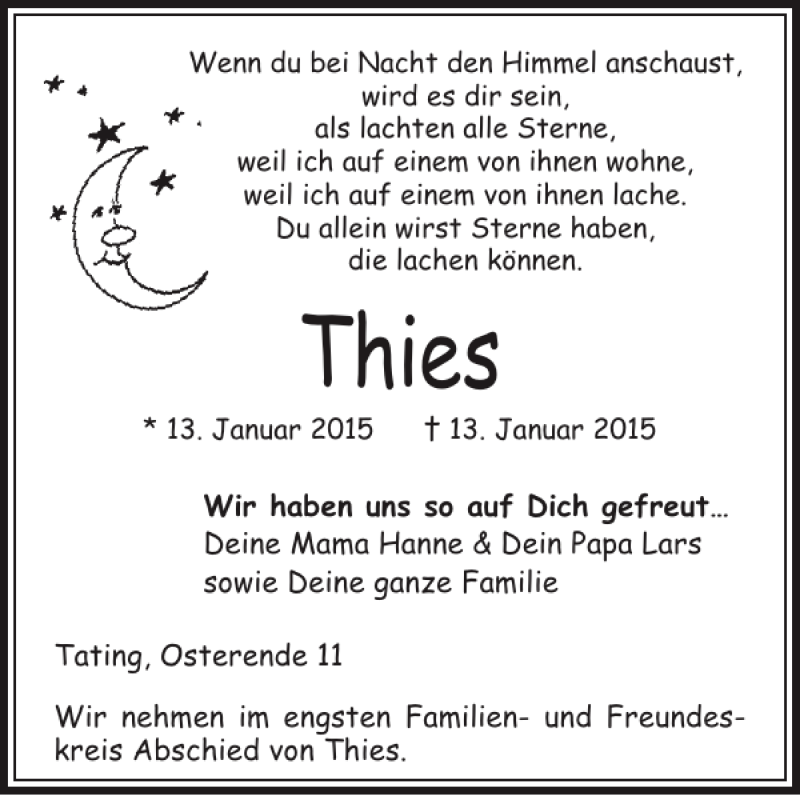 Hier finden Sie alle Traueranzeigen aus der Zeitung, die bisher für Thies erschienen sind. Weitere Traueranzeigen, die in der Zeitung erscheinen, werden hier ebenfalls aufgelistet