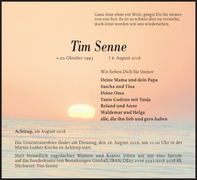 Hier finden Sie alle Traueranzeigen aus der Zeitung, die bisher für Tim Senne erschienen sind. Weitere Traueranzeigen, die in der Zeitung erscheinen, werden hier ebenfalls aufgelistet