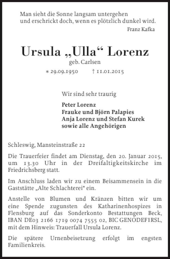 Hier finden Sie alle Traueranzeigen aus der Zeitung, die bisher für Ursula Ulla Lorenz erschienen sind. Weitere Traueranzeigen, die in der Zeitung erscheinen, werden hier ebenfalls aufgelistet
