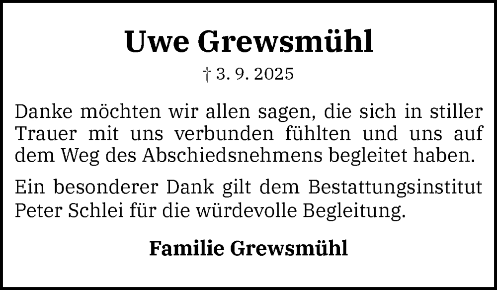 Hier finden Sie alle Traueranzeigen aus der Zeitung, die bisher für Uwe Grewsmühl erschienen sind. Weitere Traueranzeigen, die in der Zeitung erscheinen, werden hier ebenfalls aufgelistet