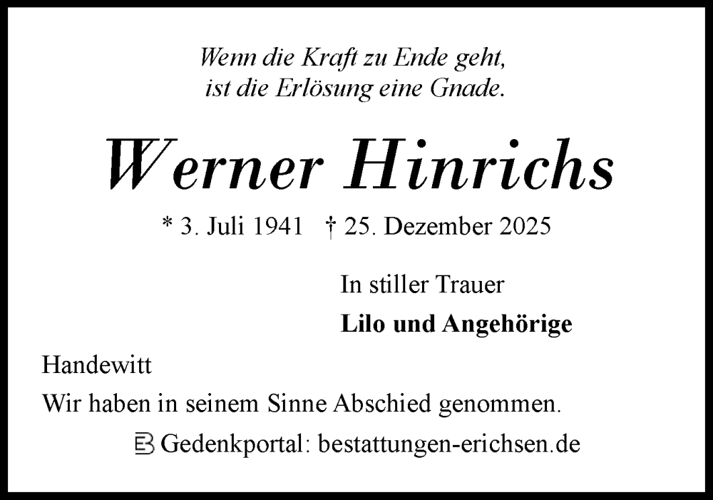 Hier finden Sie alle Traueranzeigen aus der Zeitung, die bisher für Werner Hinrichs erschienen sind. Weitere Traueranzeigen, die in der Zeitung erscheinen, werden hier ebenfalls aufgelistet