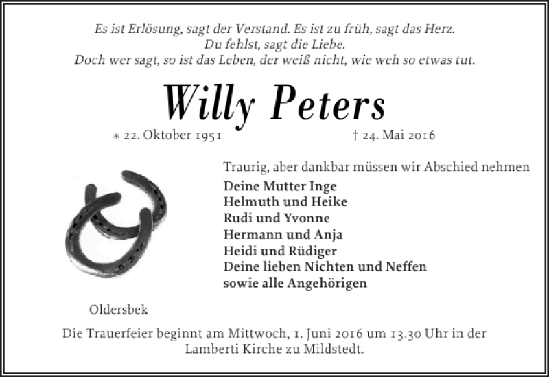 Hier finden Sie alle Traueranzeigen aus der Zeitung, die bisher für Willy Peters erschienen sind. Weitere Traueranzeigen, die in der Zeitung erscheinen, werden hier ebenfalls aufgelistet