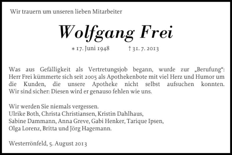 Hier finden Sie alle Traueranzeigen aus der Zeitung, die bisher für Wolfgang Frei erschienen sind. Weitere Traueranzeigen, die in der Zeitung erscheinen, werden hier ebenfalls aufgelistet